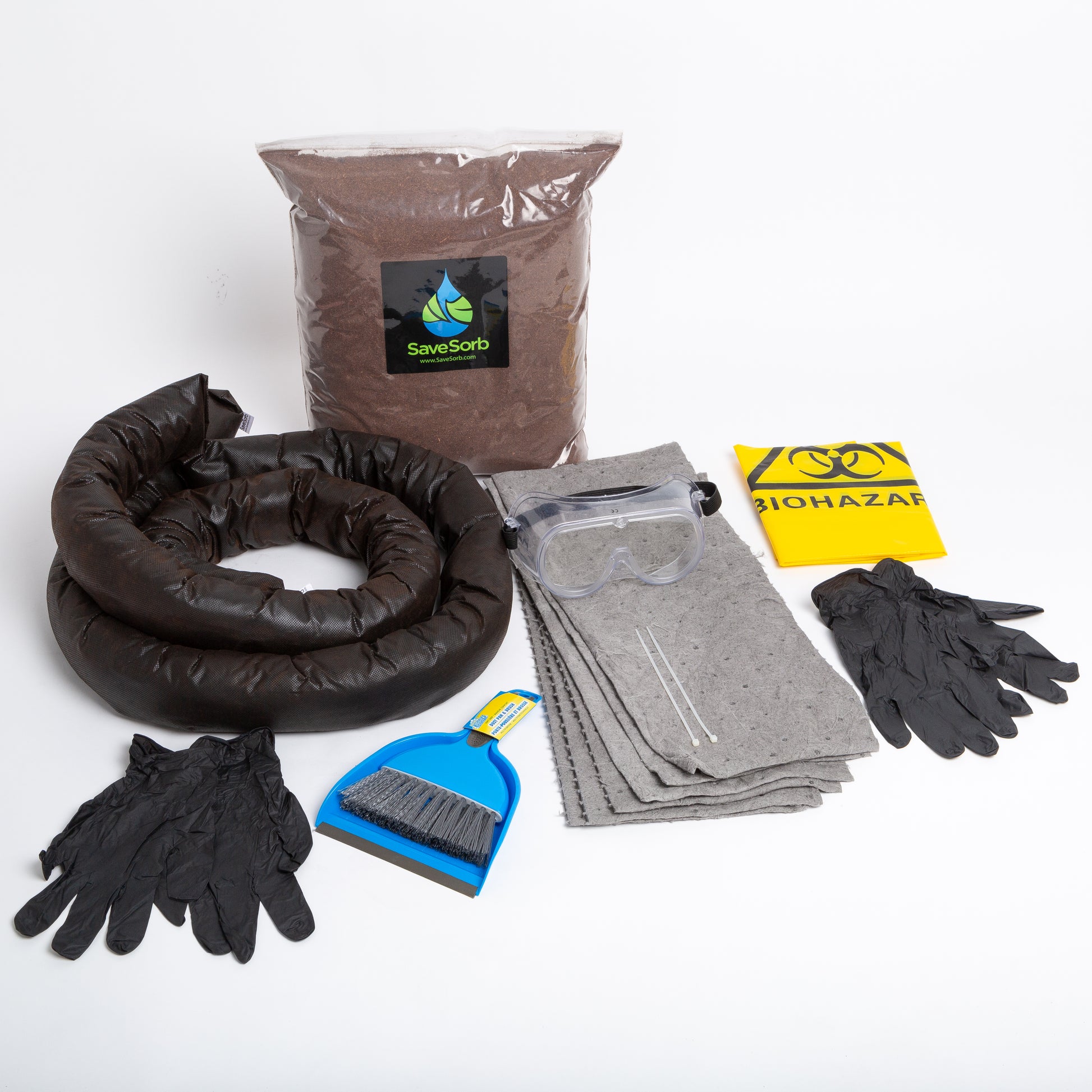 Comprehensive Kit Refill: Includes 2 Medium 4’ x4" Rapid Absorbent Socks, 1 Small Resealable Bag of SaveSorb, 6 Heavy Duty Wipes, 2 pair gloves, 2 Hazmat Disposal Bags & Zip Ties, and 1 Mini Sweeper and Dust Pan for self-contained and efficient cleanup.