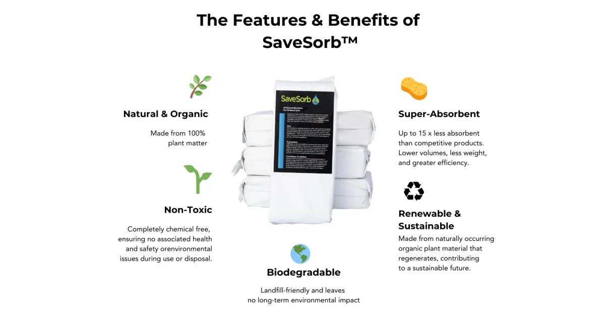 SaveSorb™ is a natural and organic absorbent made from 100% plant matter. It is hydrophobic (repels water) and oleophilic (attracts oils). When applied to spills, it quickly encapsulates hydrocarbons, such as oil, fuel, chemicals, and paints, effectively containing and absorbing them.